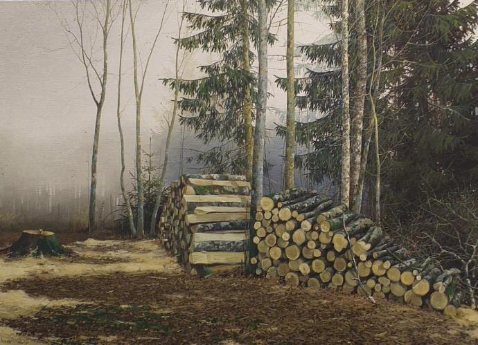 La peinture d’Anishchenko demande que l’on s’approche d’elle au plus près, que l’on se laisse happer par elle. Ses paysages sont sans bruits, sans humains, sans animaux. Rien ne vient troubler la liberté du spectateur de se faire sa place dans le décor, d’en inventer l’histoire, de se saisir de la délicatesse des détails d’une branche d’arbre, de ses feuilles, des graviers qui jonchent le sol, d’imaginer où le conduira le chemin tracé dans un pré sous un ciel d’orage, de savourer la balade qu’il fera sur l’eau après avoir décroché la barque accrochée à la rive, de sentir l’odeur de la pile de rondins de bois de chauffage, à l’orée d’une forêt…